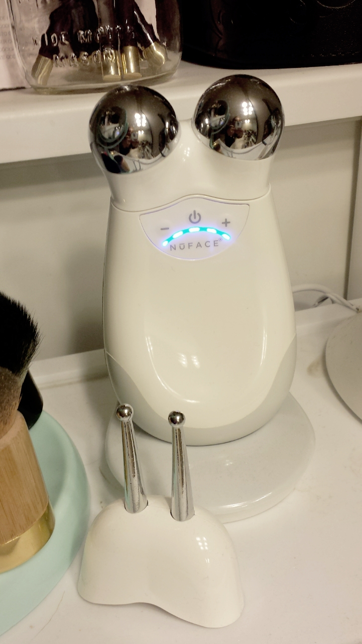 I saw this product on QVC. I have a love/hate relationship with QVC because I always seem to be making Easy Pays to them… It’s liking having a second child that I dole out a monthly allowance to, but that’s a whole ‘nother post in of itself. Back to the NuFACE Trinity… I bought mine in a combo with the Gel Primer and ELE (Effective Eye and Lip Treatment) Attachment. This device uses microcurrent to improve facial contours and skintone.
